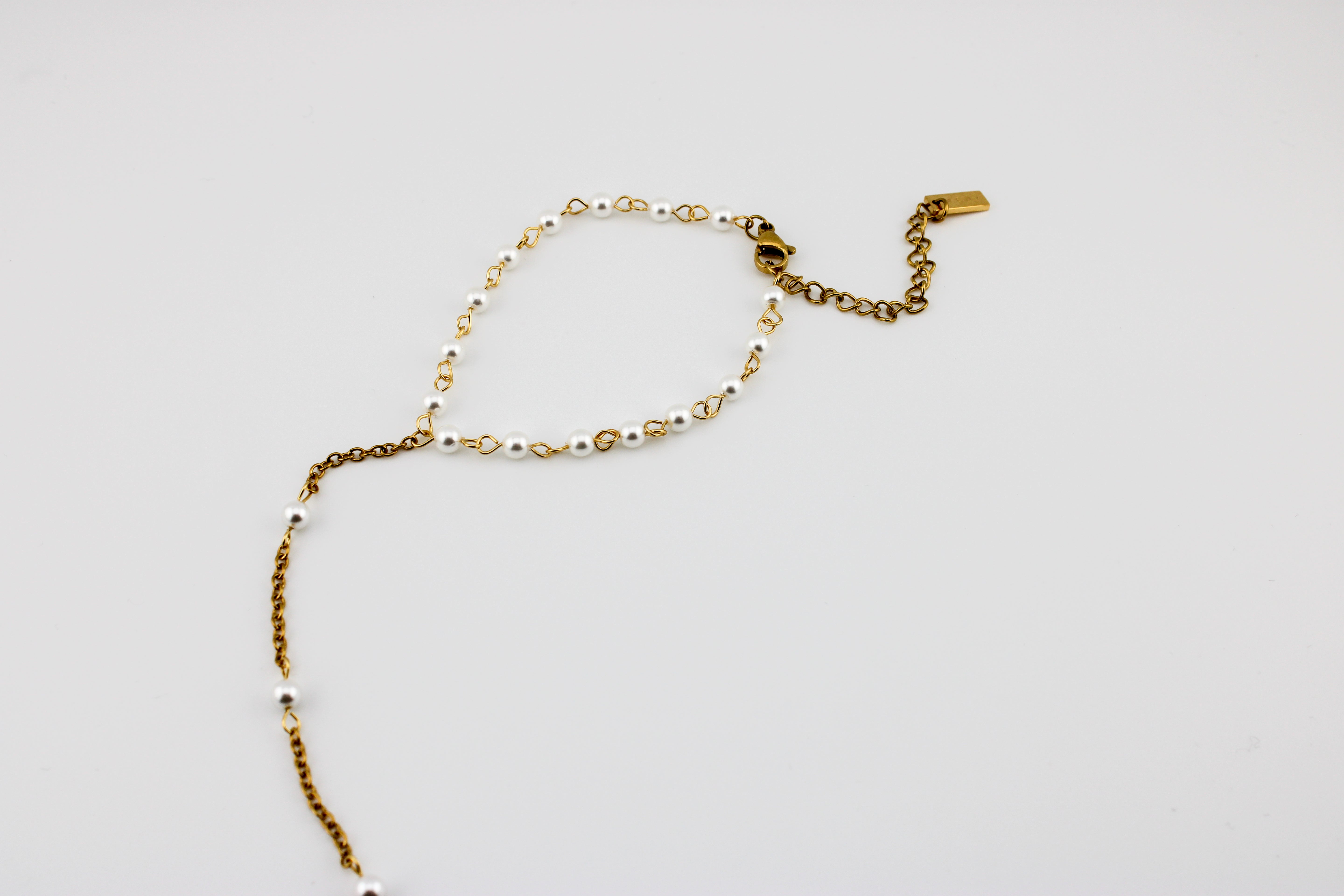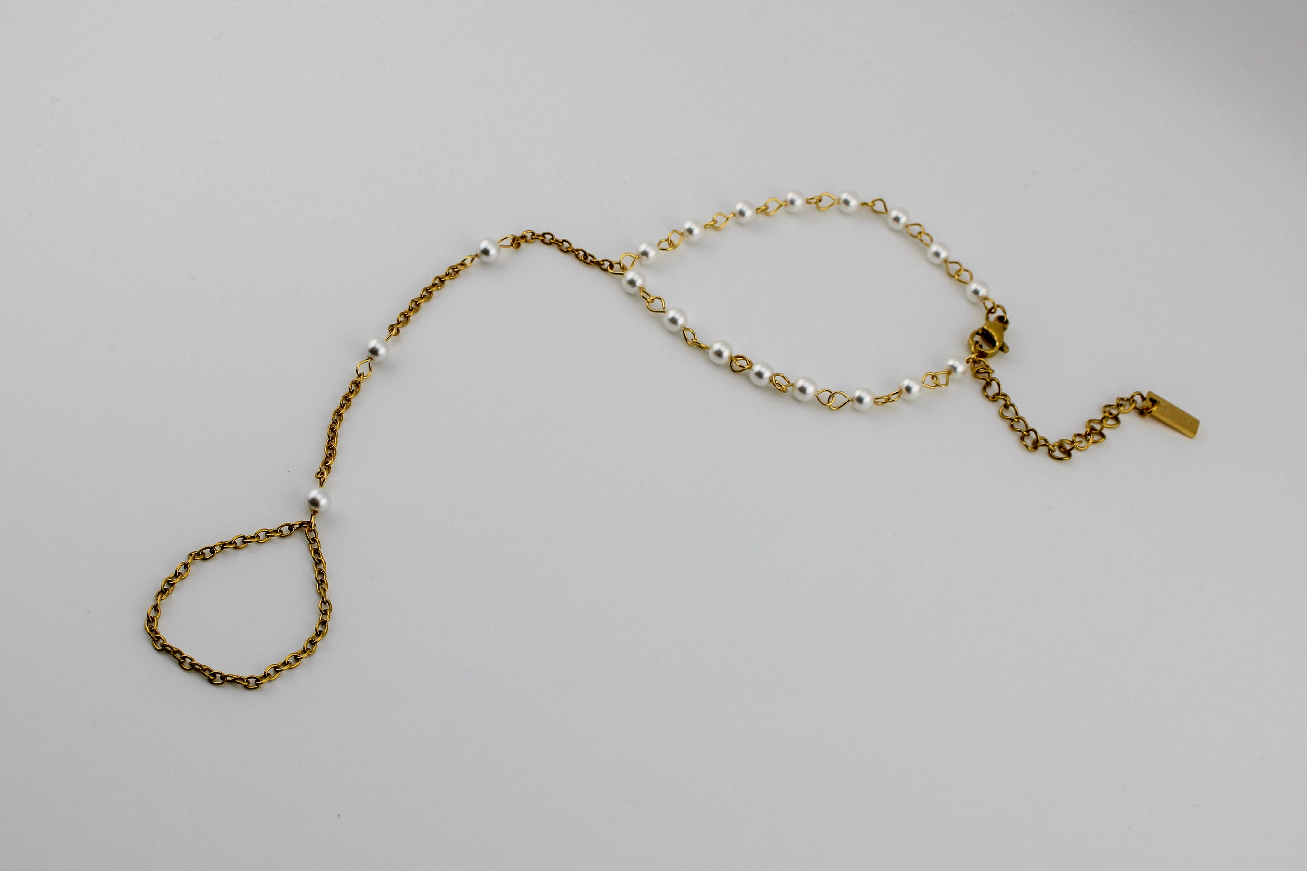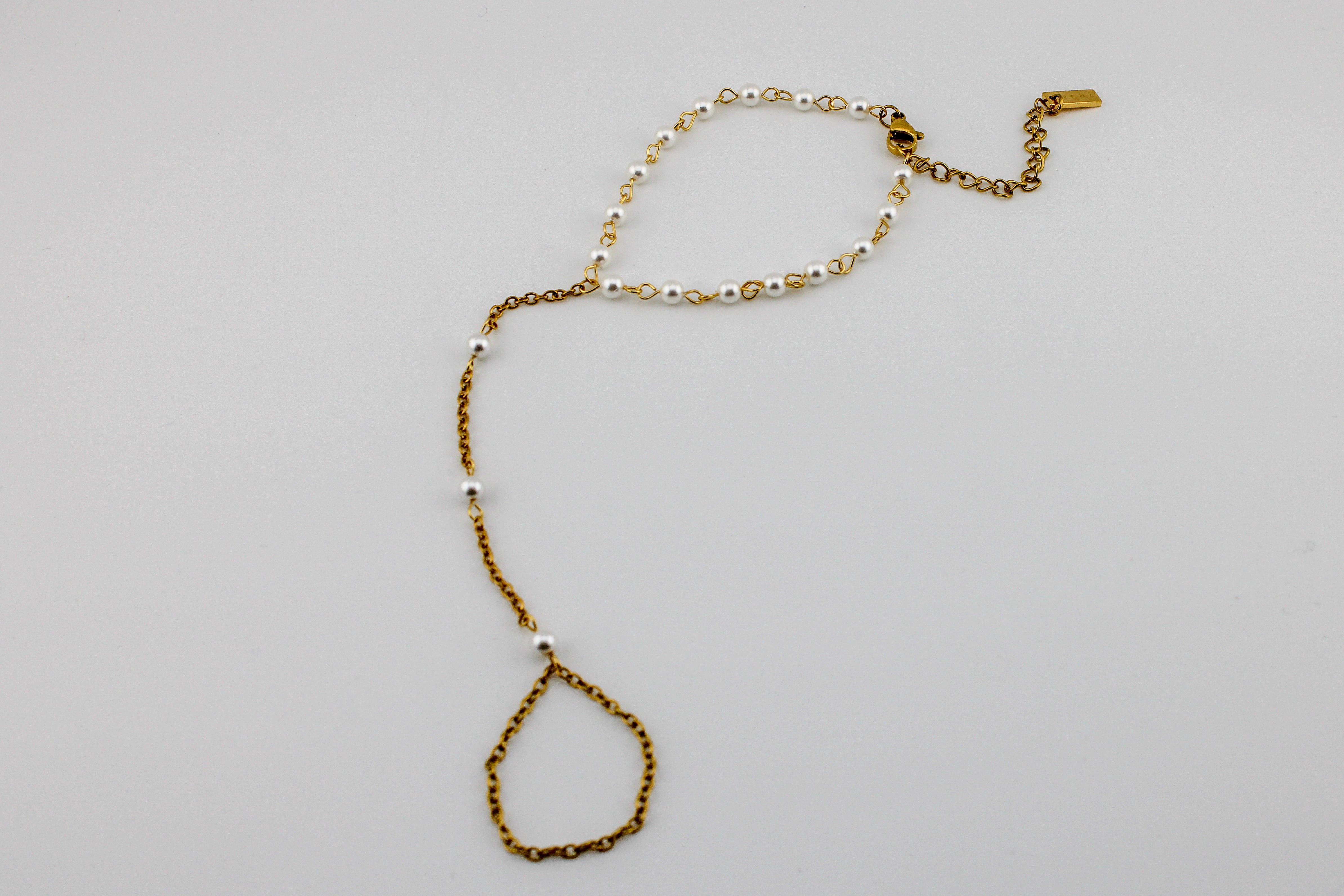 This hand chain features a delicate chain accented with pearl detailing, designed to drape gracefully from wrist to finger. Subtle yet striking, it adds a refined touch that feels both modern and timeless.